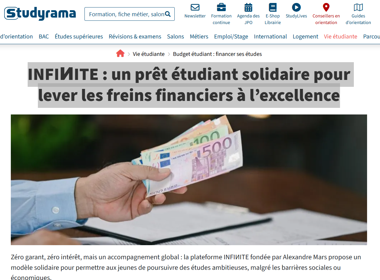 INFIИITE : un prêt étudiant solidaire pour lever les freins financiers à l’excellence Studyrama 25/11/2023